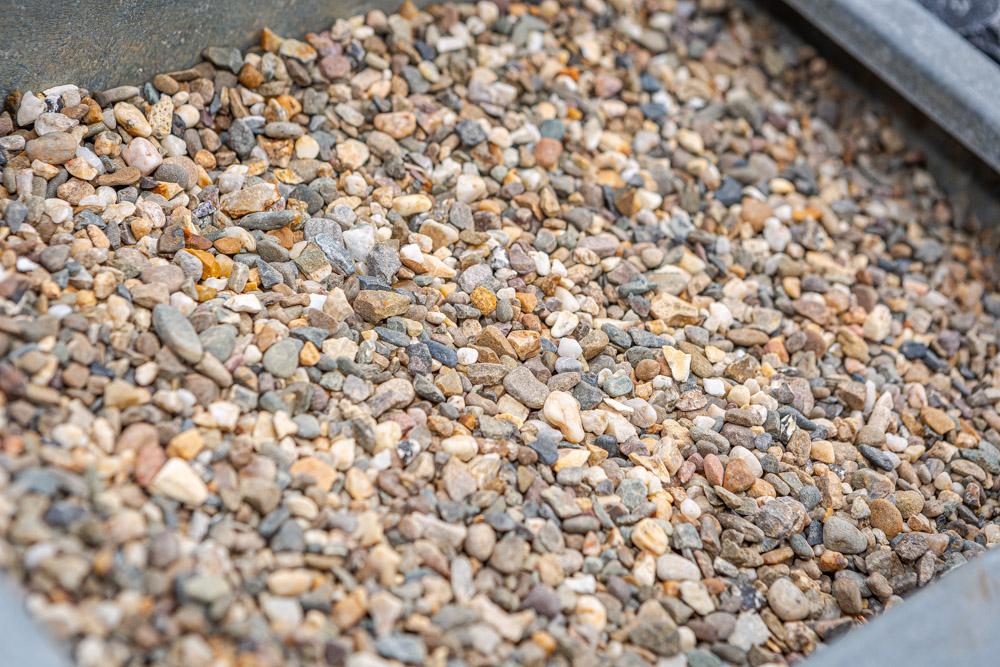 - Voor een decoratief grindbed heeft u voor een mooie grindlaag van 5 cm dik, xx Maasgrind bruin gebroken per m2 nodig.